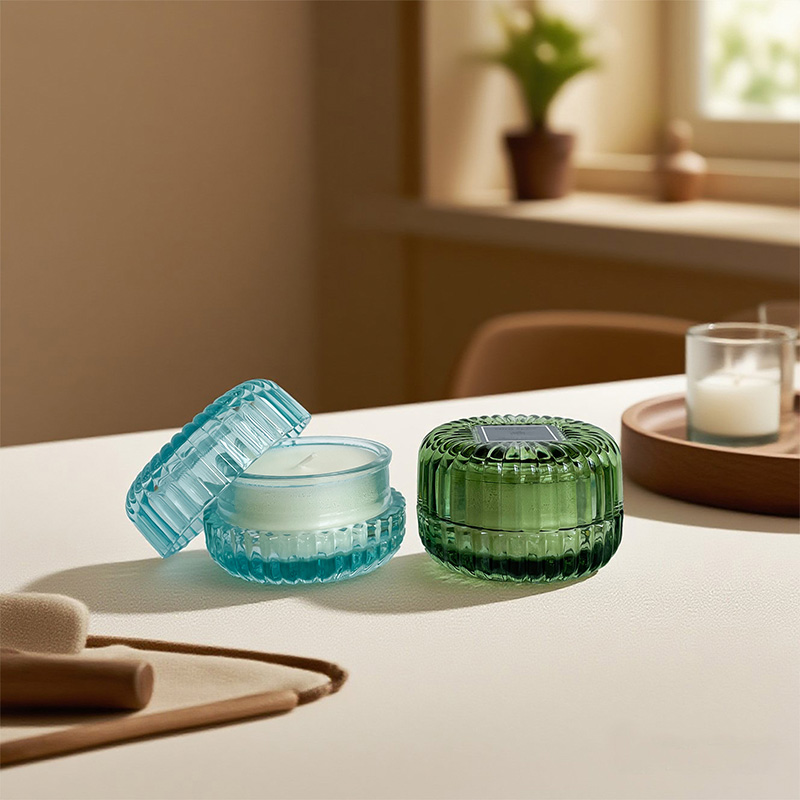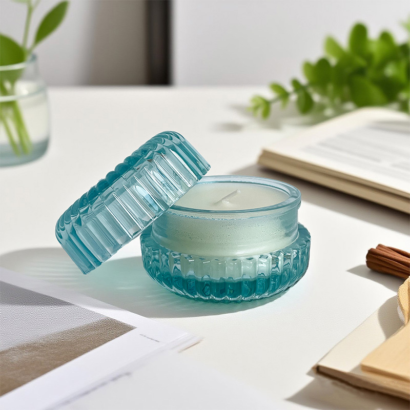 Bougie parfumée naturelle en pot en verre coloré avec étiquette simple – logo personnalisé disponible