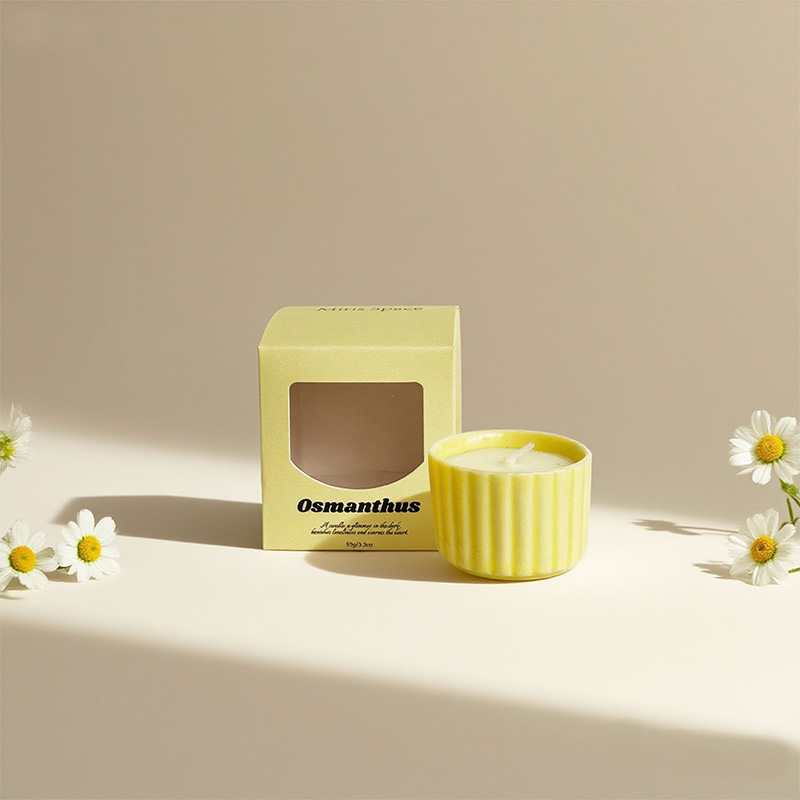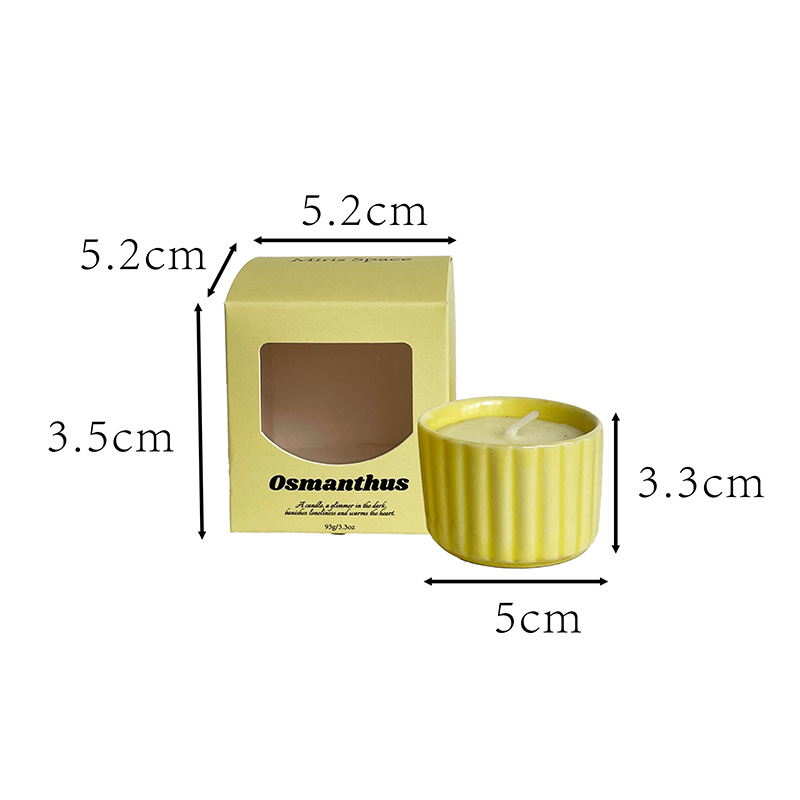 Cette bougie parfumée met l'accent sur la portabilité compacte et le design minimaliste. Fabriqué à partir de cire de soja naturelle pure, il répond parfaitement aux besoins de parfum des gens modernes à tout moment et en tout lieu. Avec un poids net de 25 grammes, la bougie est livrée dans une mini tasse en céramique, mesurant 5 cm de diamètre et seulement 3,3 cm de hauteur. Sa taille petite et délicate, ainsi que ses couleurs vives et simples, lui permettent d'être facilement placé dans une poche, un sac à main ou un coin du bureau sans prendre de place.