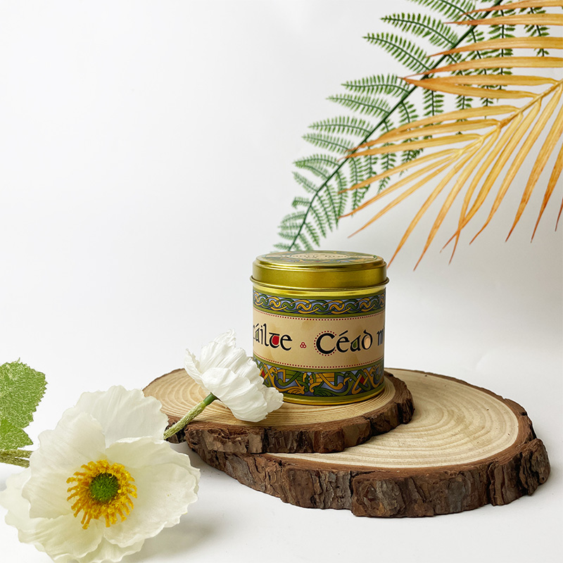 Bougie parfumée en étain doré à motif de niche, mèche en coton et cire de soja
